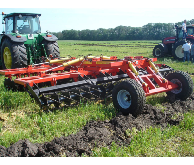В этом случае, при глубоком рыхлении до 40см, крупные комки земли, которые подымаются чизельными лапами, сразу измельчаются двумя рядами дисков. Окончательно поверхность поля выравнивается планчатым катком. И все это за один проход агрегата по полю.