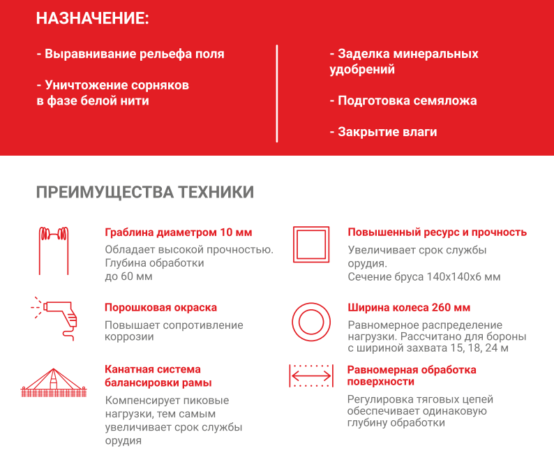 Благодаря высокому расположению брусьев бороны над почвой орудие в меньшей степени подвержено забиванию сорняками и растительными остатками.