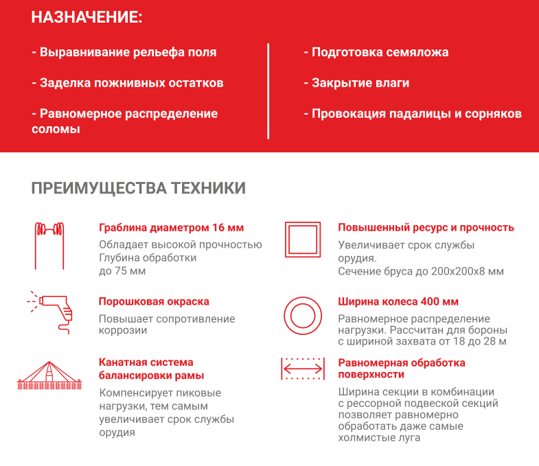 Конструкция бороны представляет собой рамную конструкцию с гидравлическим управлением. Секции бороны шириной 1.8 м., закреплены на раме на подрессоренных рычагах, которые позволяют обеспечивать постоянное давление рабочих органов на почву.
