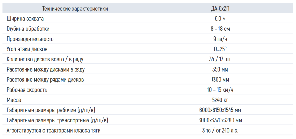 Агрегат дисковый ДА-6х2П «сидеральный» предназначен для заделки в почву сидеральных сельскохозяйственных культур с целью улучшения ее структуры, обогащения азотом и угнетения роста сорняков, ограничения распространения бактериальных и грибковых заболеваний. Агрегат также может использоваться для лущения стерни, ранневесенней разделки пласта многолетних трав, подготовки почвы после уборки пропашных и зерновых культур, ранневесеннего боронования, закрытия влаги, мульчирования (перемешивания верхнего слоя почвы с пожнивными остатками, навозом и другими органическими веществами)