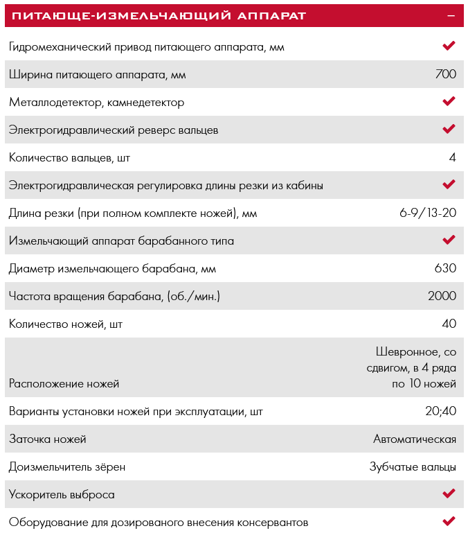 • Плавная регулировка длины резки просто и удобно производится из кабины поворотом регулятора на пульте управления в двух диапазонах: 6-8 и 11-15 мм (при 40 ножах). Для более крупного измельчения предусмотрена возможность работы с 20 ножами на барабане.