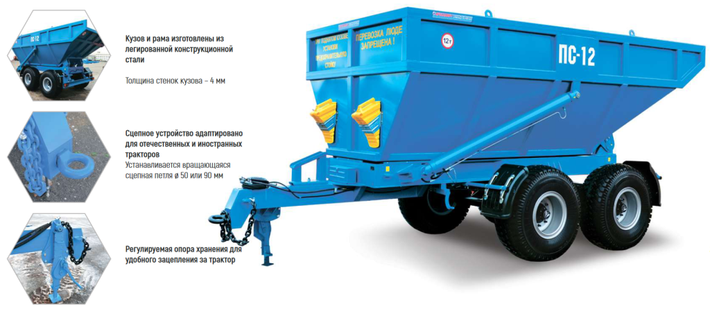 Полуприцеп ПС-12 предназначен для перевозки твердых, сыпучих и полужидких грузов (зерно, корнеплоды, зеленая масса, силос, сенаж, зерносенаж, навоз, птичий помет, торф, песок, гравий, удобрения, опилки, снег и пр.) по всем видам дорог и в полевых условиях.