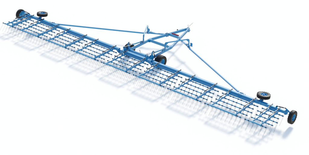 Борона с пружинным зубом полуприцепная гидрофицированная тяжелая ПОБЕДА БЗГТ-15. Ширина захвата бороны — 15,9 м. Производительность 15-23 гектара в час.