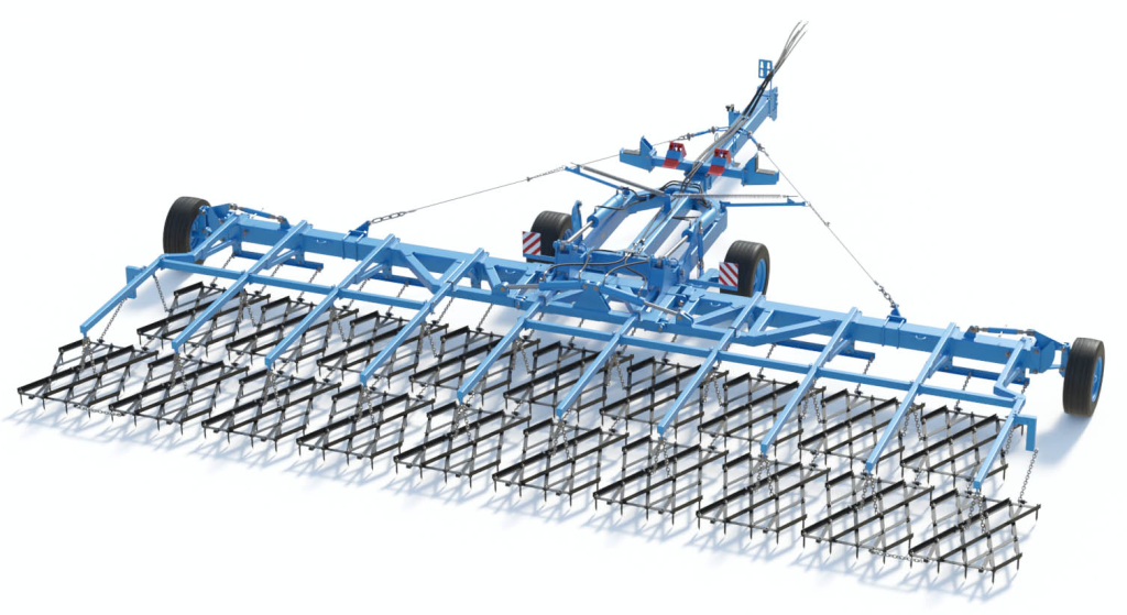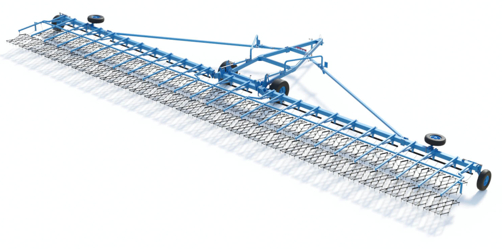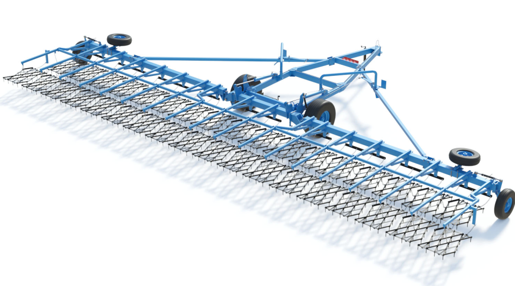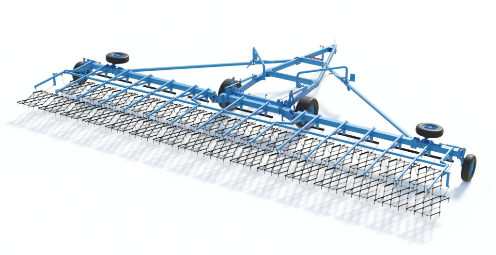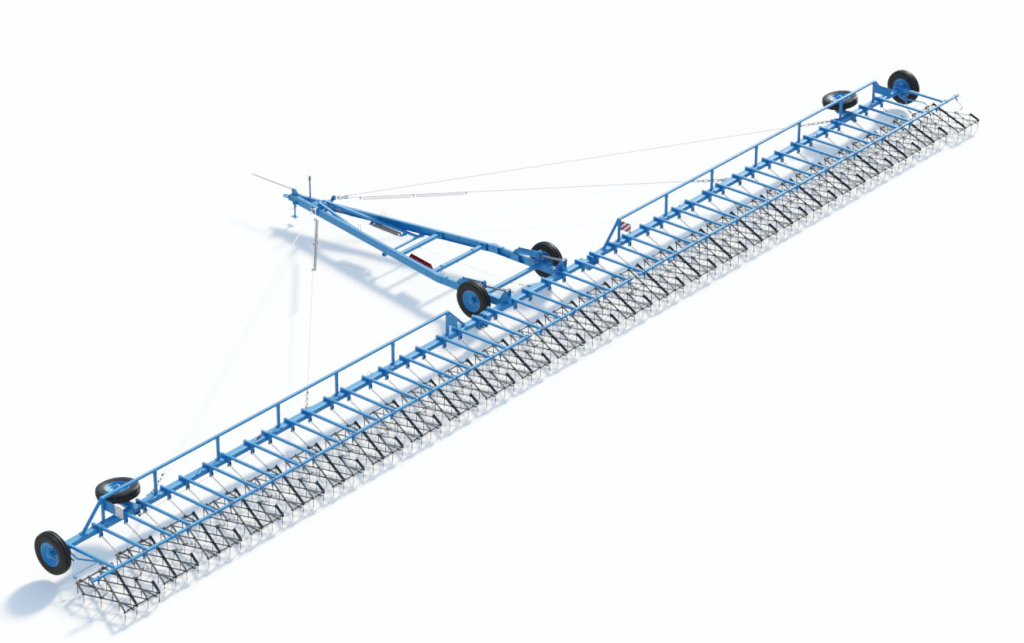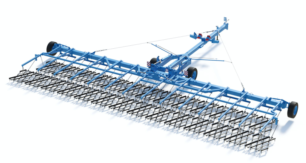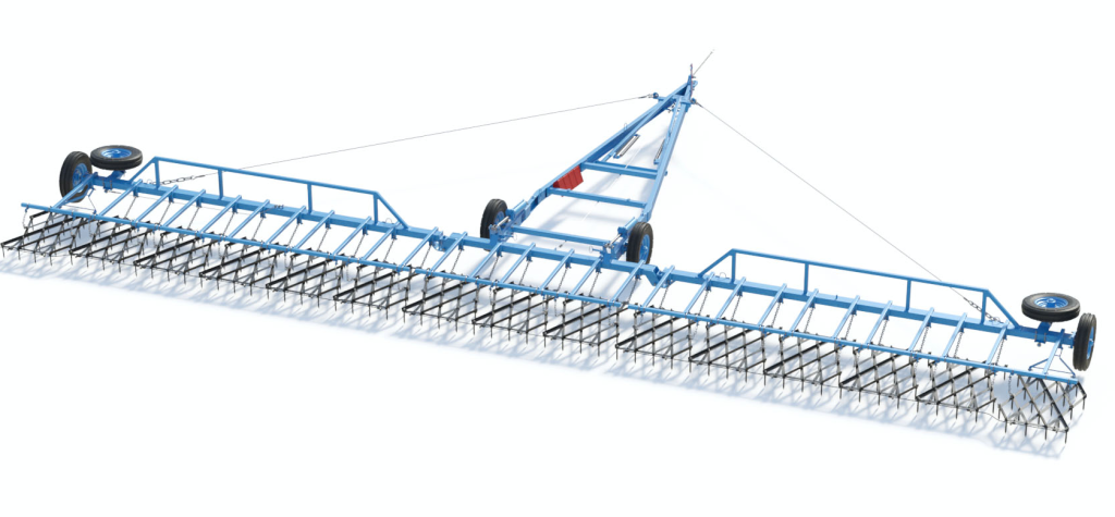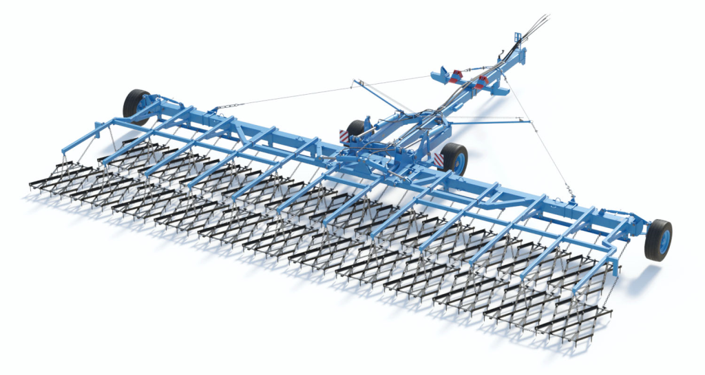 Сцепка зубовых борон гидрофицированная ЗАРЯ СБГ-21-1. Ширина захвата сцепки — 21 м. Производительность 25 гектаров в час.