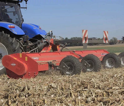 Высота измельчения растительной биомассы настраивается либо при помощи поворотных колес, которые регулируются по высоте и в боковом направлении, для измельчения растительных остатков, либо при помощи катка для обработки паровых и лугопастбищных территорий.