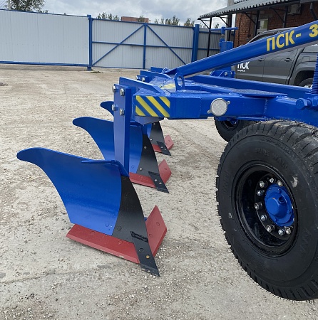 Плуг навесной трехкорпусной марки ПСКуМ-3 (плуг скоростной комбинированный универсальный модернизированный) предназначен для пахоты под зерновые и технические культуры, на глубину 16-35 см почв, не засоренных камнями, плитняком и другими препятствиями, с удельным сопротивлением до 0,1МПа, твердостью почвы до 4 МПа и влажностью до 30%. Агрегатируется с тракторами ДТ-75М, ХТЗ-16131, МТЗ-1025 и импортными аналогами. При установке адаптера навески, возможно агрегатирование с тракторами МТЗ – 82.1, МТЗ – 892, МТЗ – 1021 и их модификациями. При этом трактор работает не по борозде, а рядом с ней.Среднедневная выработка в агрегате с трактором МТЗ-1025 составляет 8 – 12 га, при этом экономия горючего (по сравнению с использованием плуга ПЛН-3-35) составляет 5 – 8 литров/га.