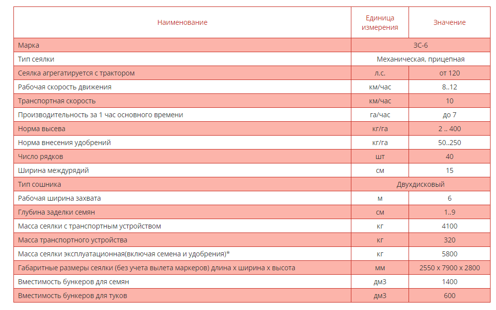 Сеялка ЗС-6, предназначенная для рядового посева семян зерновых (пшеница, рожь, ячмень, овес), зернобобовых (горох, фасоль, соя, чечевица, бобы, чина, нут, люпин), мелкосемянных культур (рапс, горчица), сыпучих и среднесыпучих семян трав,с одновременным внесением минеральных удобрений и прикатыванием почвы в засеянных рядках. Может быть использована для посева семян других культур, близких к зерновым по размерам семян и нормам высева (гречиха, просо, сорго и др.)